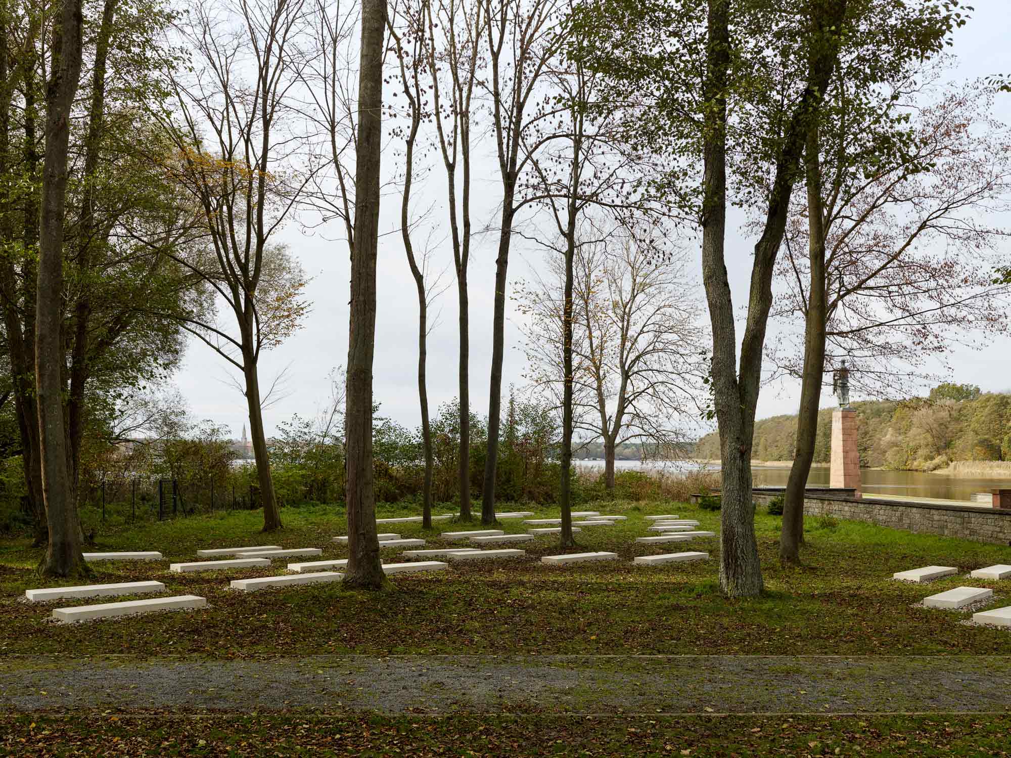 Das Gedenkzeichen für die jüdischen Häftlinge des Frauen-Konzentrationslagers Ravensbrück befindet sich auf einer mit Bäumen bestandenen Wiese zwischen dem Ufer des Schwedtsees und der ehemaligen Lagermauer. Die idyllische Situation des gerahmten Hains mit Blick über den See auf das Städtchen Fürstenberg steht in schmerzhaftem Kontrast zu der Gewalt, die sich diesem Ort unauslöschlich eingeschrieben hat.