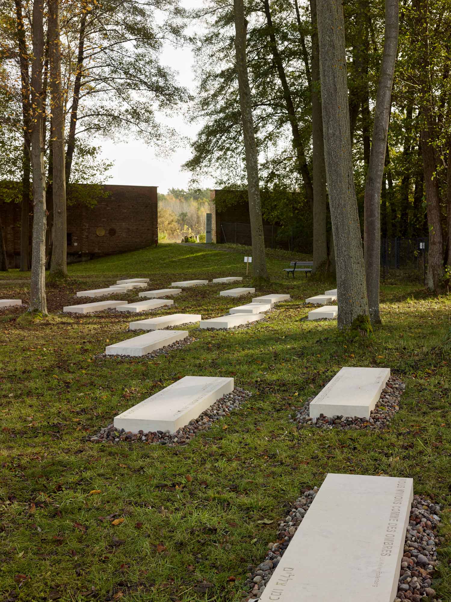 Liegende Steine, roh, mit in der Oberfläche eingravierten Inschriften, Zitate von jüdischen Frauen, Männer und Kinder, die im Konzentrationslager Ravensbrück inhaftiert waren, erinnern und legen offen darüber Zeugnis ab.
