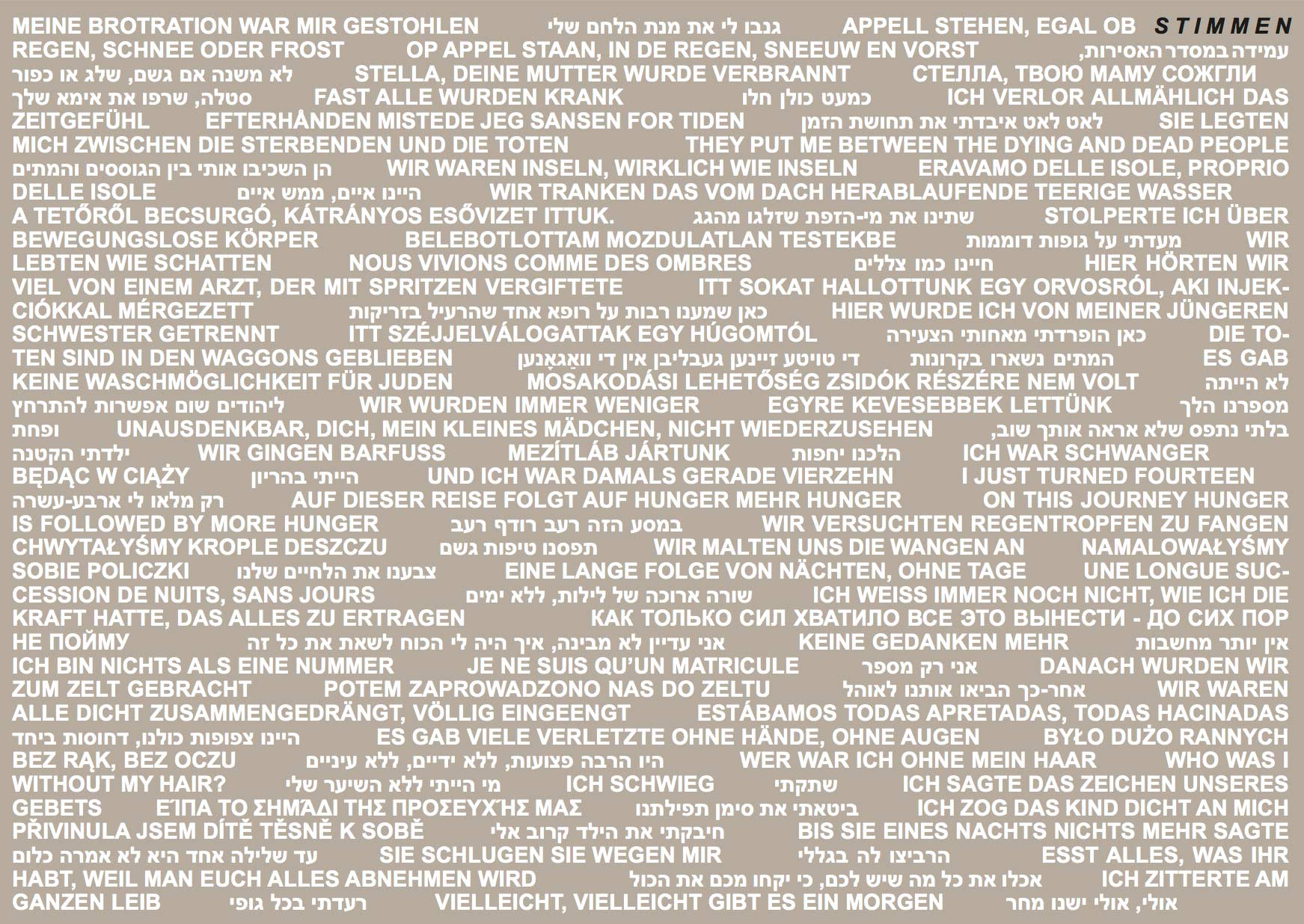 Die fragmentarisch kurzen Aussagen klingen wie Stimmen im „Hier und Jetzt“. Stellvertretend vergegenwärtigen sie konkrete Wahrnehmungen, Gefühltes und Erfahrenes. Ihre Worte erzählen vom Alltag in ständiger Angst und Entbehrung, von Sorge um die Angehörigen und vom Versuch, Menschlichkeit inmitten der Gewalt zu bewahren. Die Sprache der Stimmen bleibt beschreibend. Sie setzt weniger auf eine Wertung des Geschehenen, sondern vertraut auf die innewohnende Würde der Worte. Die Vielsprachigkeit bestätigt die Tatsache, dass die Inhaftierten aus ganz Europa an diesen Ort verbracht wurden. Die Verständigung war auch deshalb nur erschwert möglich.
